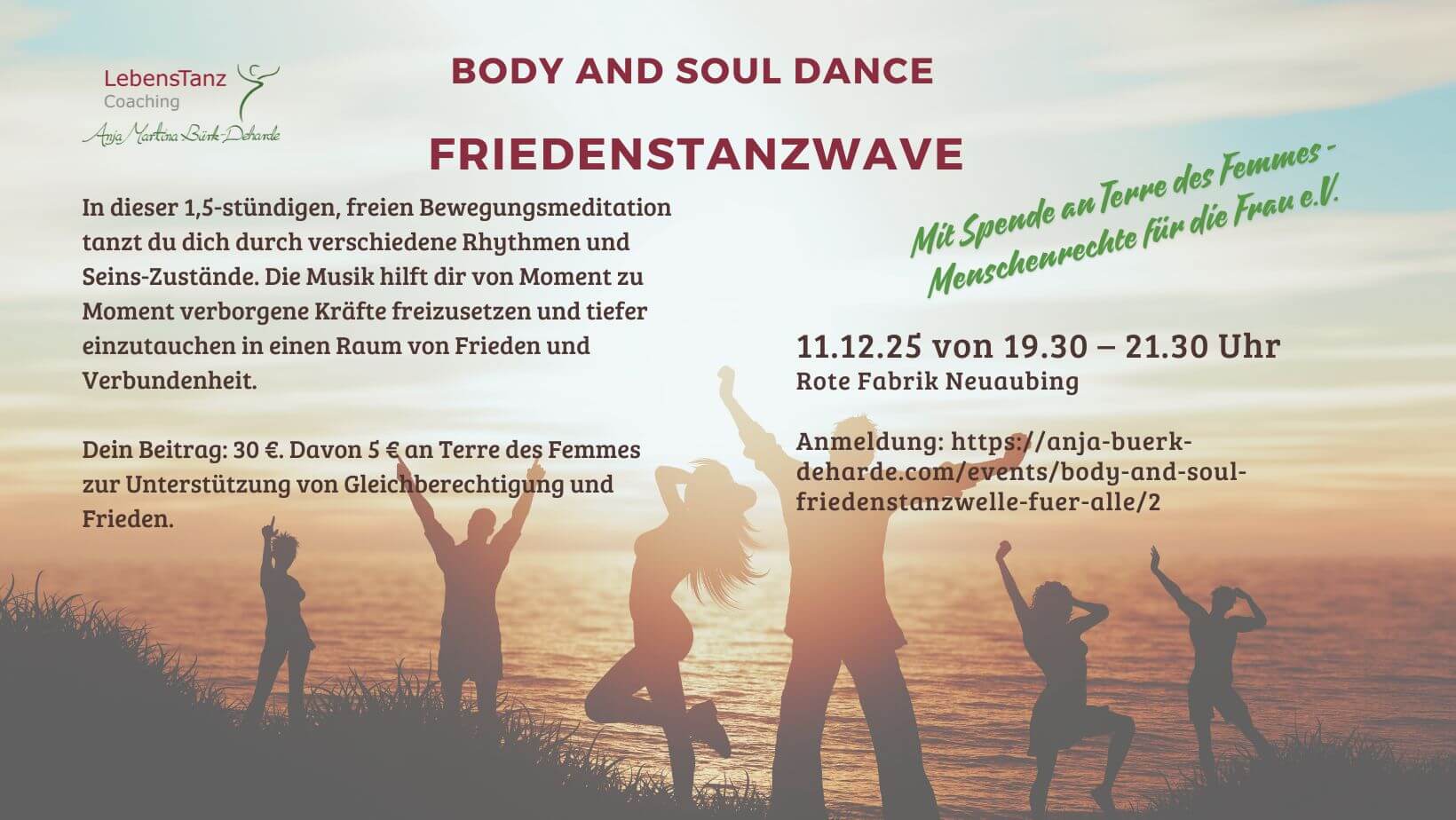 Der Tanz zwischen diesen beiden Polen birgt das Potential zu tiefen inneren Frieden, der sich auch im Außen zeigt. Die Energie, die du im Tanz freisetzt, führt dich in das Mysterium deines fühlenden Körpers – direkt in dein Herz! Erlebe dich als Teil von allem was ist und gib deiner Sehnsucht nach Frieden Ausdruck.
